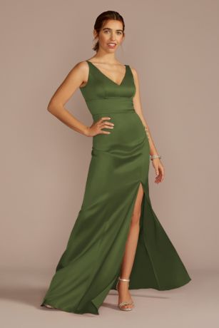 - What bouquets complement olive bridesmaid dresses? Celebrate DB Studio Stretch Satin V-Neck Tank Sheath Dress in Martini Olive Size: 12 David's Bridal